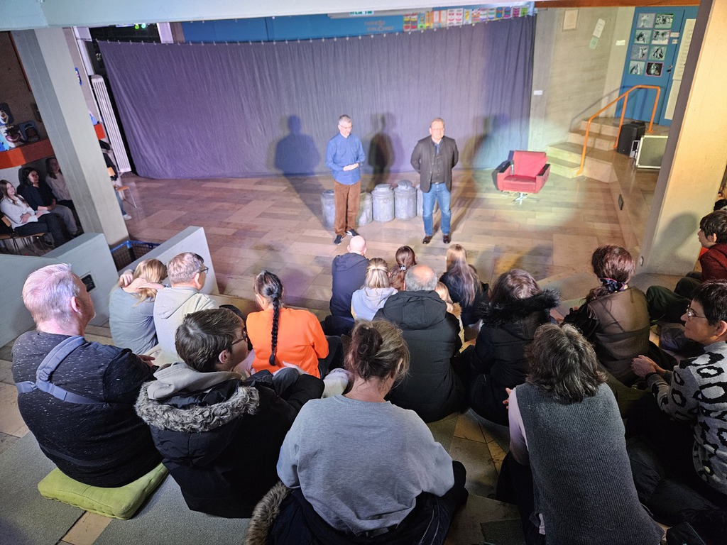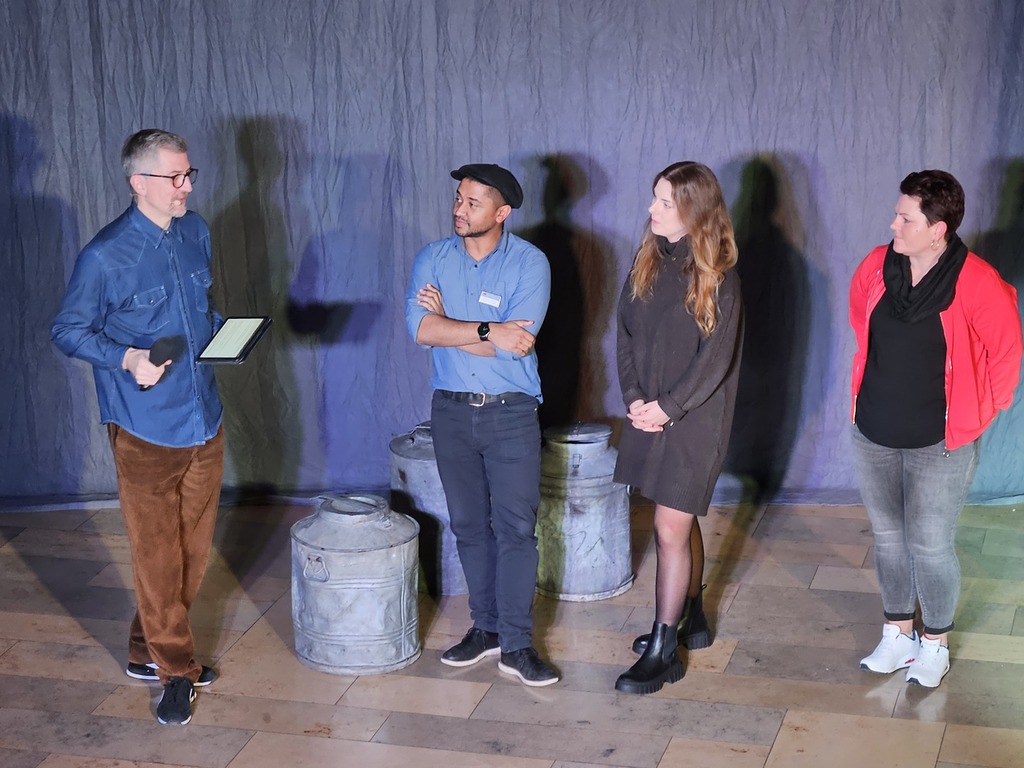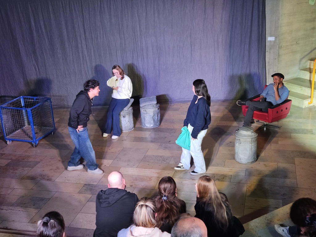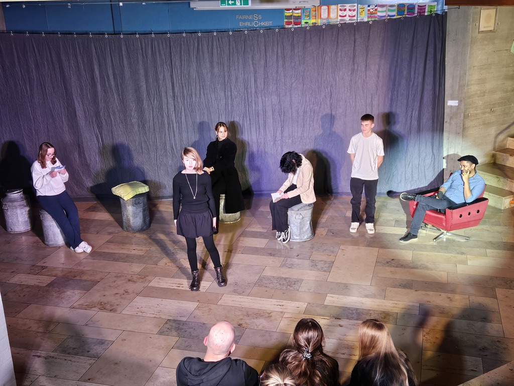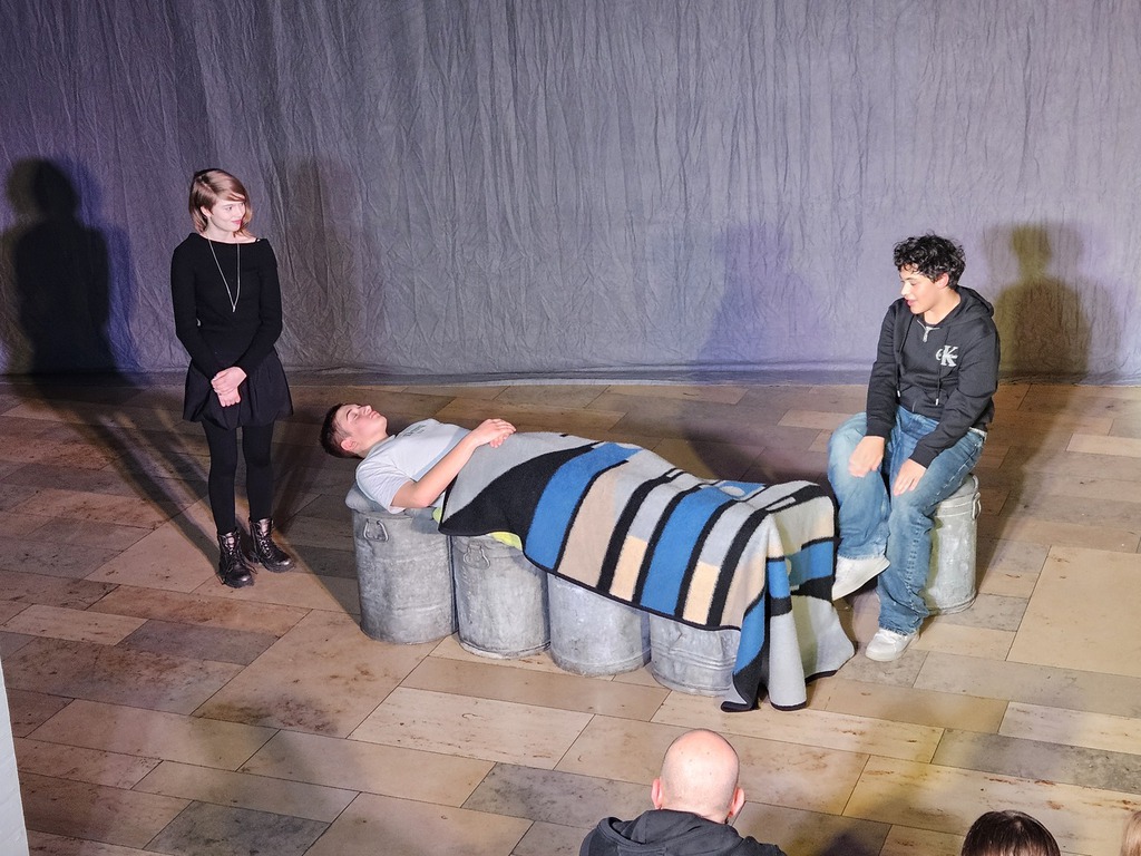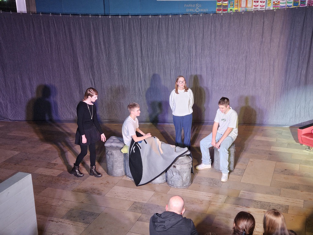Zu Beginn unseres Theaterprojektes besuchten uns vier Pflegeexpertinnen und –experten, die jeweils zwei Geschichten aus ihrem Berufsalltag mitbrachten. Diese Geschichten setzten wir anschließend in Theaterszenen um. Für das Bühnenbild stellte man uns fünf große Milchkannen zur Verfügung.